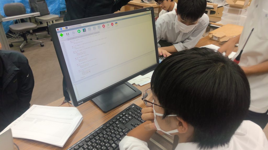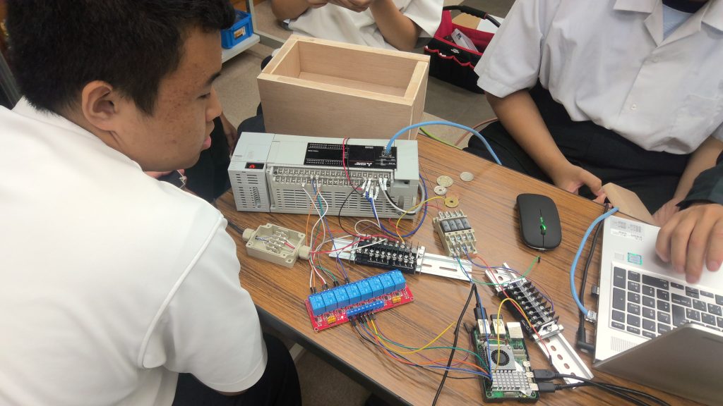 4月から地元企業である株式会社メカメイト様にサポートしていただき、安全面や技術面における講習を受けながら、「おみくじを点字で作るロボット」の製作に取り組んできました。Raspberry PiやPLC、ロボットのティーチングなど、初めて学ぶことばかりでしたが、約1年間メカメイトの方の力を借りながら、技術・技能を身に付けていきました。