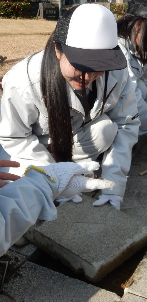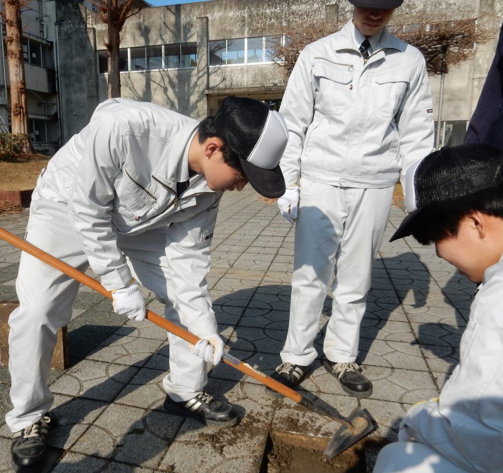 2月12日(木)に本校の2棟、3棟間にある記念庭園のタイルの張り直しを行いました。経年劣化で、一部のタイルが凸凹になっていたものを1枚ずつ丁寧に剥がし、目土を入れ直し、突き棒でしっかり突き固め動かないようにしました。3年生は今回が最後の実習で、とても楽しそうに行っていました。