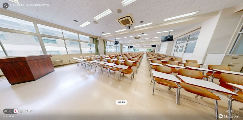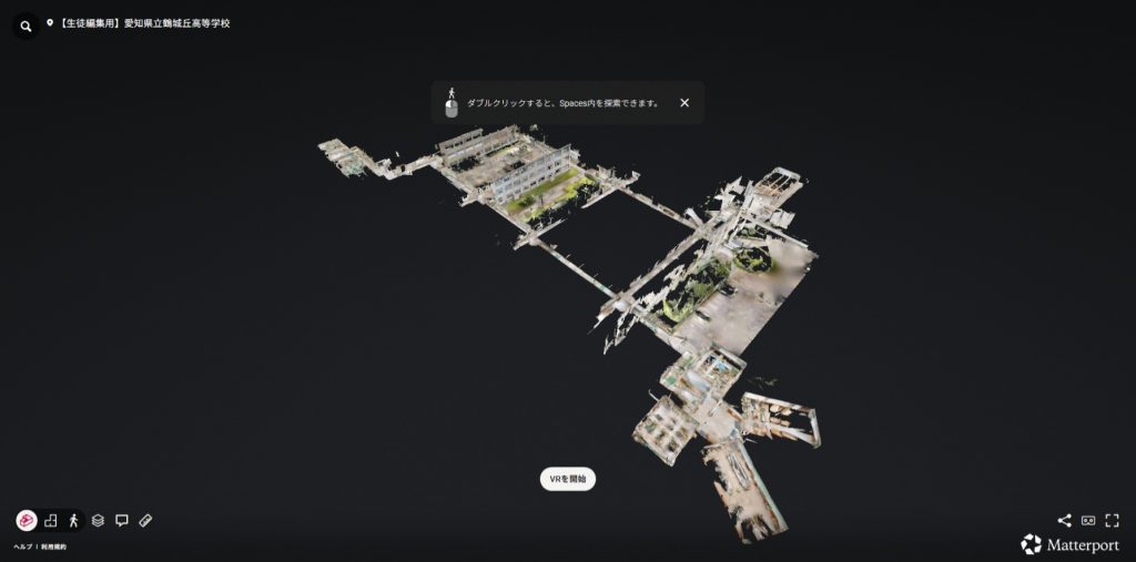 DXハイスクール事業の委託事業として情報システム系列の生徒が総合的な探究の時間において(株)サンリアリティ様と連携し、「VR School Tourプロジェクト」を実施しました。Matterport Pro3で鶴城丘高校をVR化し、VR校内見学のデータの制作をし進めました。